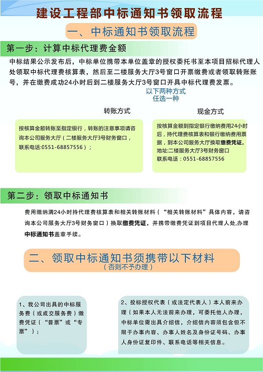 費(fèi)用繳納滿24小時(shí)持代理費(fèi)核算表和相關(guān)轉(zhuǎn)賬材料(“相關(guān)轉(zhuǎn)賬材料”具體內(nèi)容,請(qǐng)咨詢本公司服務(wù)大廳3號(hào)財(cái)務(wù)窗口)換取繳費(fèi)憑證,并攜帶繳費(fèi)憑證到項(xiàng)目代理人處,辦理中標(biāo)通知書蓋章手續(xù)。